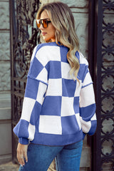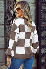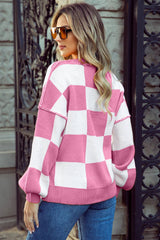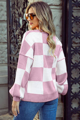 Checkered Bishop Sleeve Sweater: Pink / S