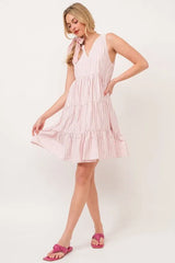 This sleeveless V-neck tiered dress features a stylish striped pattern for a fun and chic look. The V-neck design adds a flattering touch to the neckline. Perfect for a casual yet fashionable outfit in warm weather.