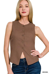 A linen button-down vest is a versatile and stylish piece that can be worn in various ways to elevate your outfit. The linen fabric makes it lightweight and breathable, perfect for warm weather or layering during cooler seasons. The button-down design adds a sophisticated touch, and you can dress it up or down depending on the occasion. Pair it with a blouse and trousers for a chic workwear look, or wear it over a dress or with jeans for a casual yet polished ensemble. The vest can also be worn open or closed, giving you options to style it according to your preference. Overall, a linen button-down vest is a great addition to your wardrobe for adding an extra layer of interest and style to your outfits.