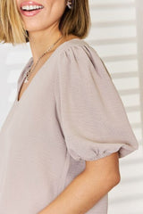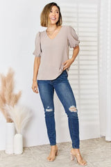 The V-neck puff sleeve top is a stylish and feminine addition to your wardrobe. The V-neckline adds a touch of elegance and sophistication, while the puff sleeves bring a hint of romance and drama. The top is crafted from a comfortable and breathable fabric, ensuring all-day comfort. Its versatile design allows for easy dressing up or down - pair it with jeans for a casual day look, or dress it up with a skirt and heels for a more polished ensemble. With its flattering silhouette and trendy details, this V-neck puff sleeve top is a must-have for the fashion-forward individual.