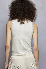 This top features a round neck and a fitted sleeveless silhouette, made from comfortable jersey fabric. It is adorned with elegant lace trim details. The design offers a sleek and flattering fit. Perfect for layering or wearing on its own, this top is versatile for various occasions.