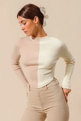 This sophisticated dual-tone pullover features a premium ribbed knit construction with an eye-catching color block design. Made from high-quality stretch knit material that provides both comfort and style. The garment showcases a form-fitting silhouette with long sleeves and a high neckline. The neutral beige and cream color palette creates a versatile piece perfect for layering or standalone wear. The seamless color transition and ribbed texture add visual interest while maintaining an elegant, minimalist aesthetic. Ideal for casual to semi-formal occasions with its contemporary design and comfortable fit.